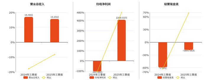 公司营业总收入为15.05亿元。归母净利润为2268.02万元,较去年同报告期归母净利润增加2865.11万元。经营活动现金净流入为-5891.66万元,较去年同报告期经营活动现金净流入增加1.30亿元。