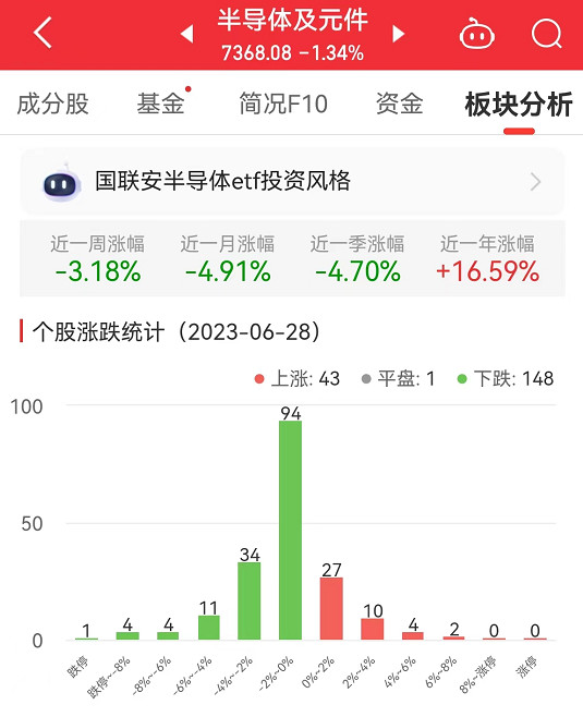 中国经济网北京6月28日讯 今日,半导体及元件板块整体跌幅1.34%,其中,43只股票上涨,1只股票平盘,148只股票下跌。
