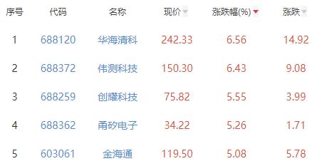 其中,华海清科、伟测科技、创耀科技、甬矽电子、金海通位列板块涨幅前五位,涨幅分别为6.56%、6.43%、5.55%、5.26%、5.08%。