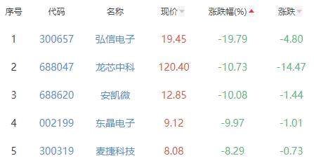 弘信电子、龙芯中科、安凯微、东晶电子、麦捷科技位列涨幅榜后五位,涨幅分别为-19.79%、-10.73%、-10.08%、-9.97%、-8.29%。