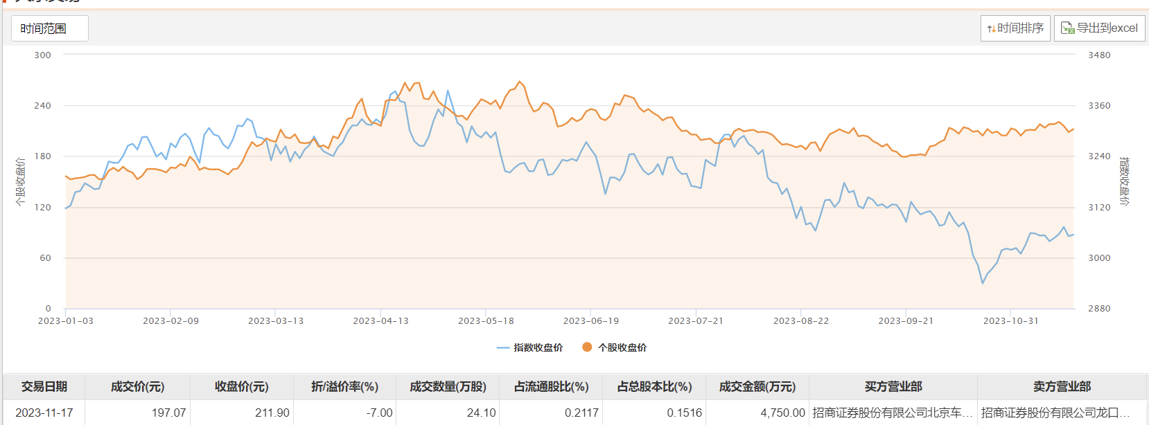 今日大宗交易成交24.1万股,成交额4750万元,占当日总成交额的19.19%,成交价197.07元,较市场收盘价折价7%。