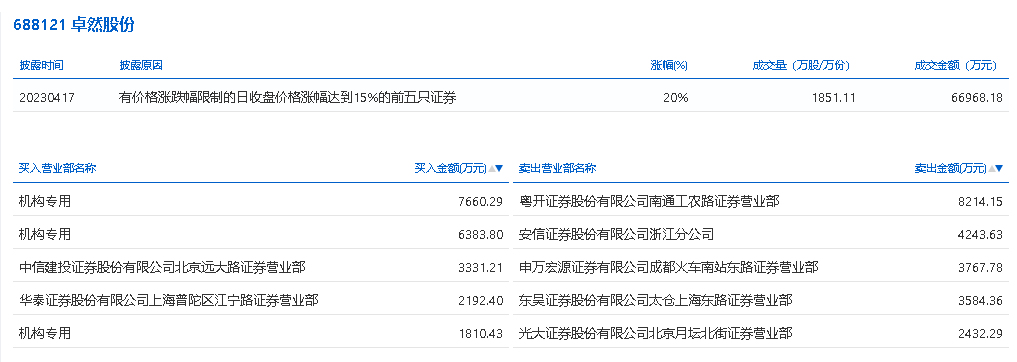 4月17日,卓然股份今日涨停,龙虎榜数据显示,上榜营业部席位全天成交4.36亿元,占当日总成交金额比例为65.14%。其中,买入金额为2.14亿元,卖出金额为2.22亿元,合计净卖出864.08万元。