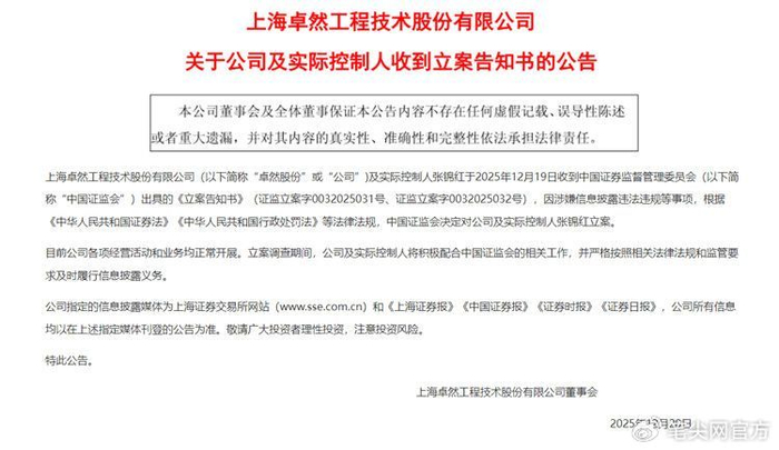 12月20日,卓然股份发布公告披露,公司于2025年12月19日收到上海证监局出具的《关于对上海卓然工程技术股份有限公司采取责令改正措施并对张锦红、吴玉同、张笑毓采取出具警示函措施的决定》(以下简称《决定书》)。