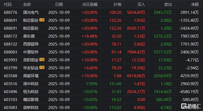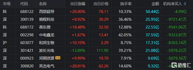 龙虎榜中涉及机构专用席位的个股中,当日净卖出额前三为西部超导、晓程科技、燕东微,分别为4.99亿元、9721.41万元、9541.06万元。