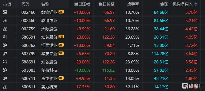 龙虎榜中涉及机构专用席位的个股中,当日净买入额前三为赣锋锂业、天际股份、灿芯股份,分别为5.21亿元、4.42亿元、3.58亿元。