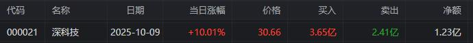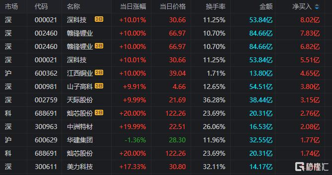 龙虎榜单日净买入额前三为赣锋锂业、深科技、天际股份,分别为7.83亿元、5.51亿元、3.15亿元。