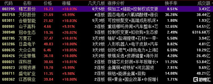 焦点股方面,低价股山子高科14天9板,锂电池概念天际股份4连板,有色金属板块全天强势,其中精艺股份6天5板,可控核聚变概念合锻智能5天3板。