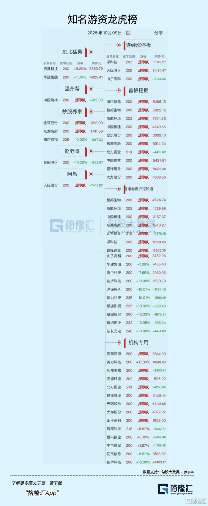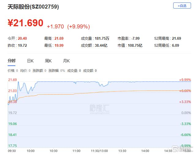 天际股份:连续涨停4天,换手率36.28%,成交量181.75万手,成交额38.44亿元。龙虎榜数据显示,机构合计净买入4.42亿元。章盟主等知名游资榜上有名。