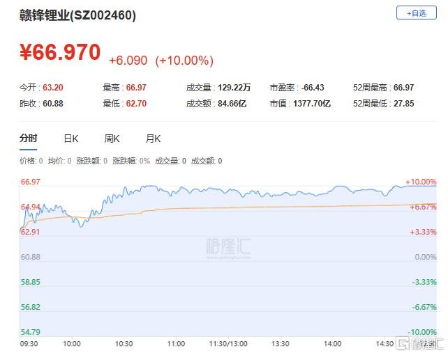 赣锋锂业:今日涨停,换手率10.7%,成交量129.22万手,成交额84.66亿元。龙虎榜数据显示,机构合计净买入5.21亿元,北向资金合计净买入1.6亿元。章盟主等知名游资榜上有名。