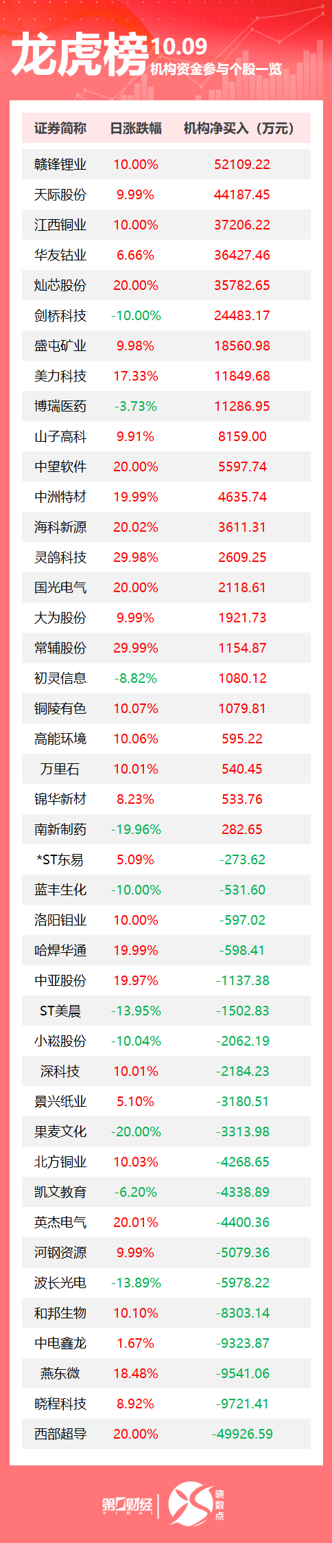 当天机构净买入前三的股票分别是赣锋锂业、天际股份、江西铜业,净买入金额分别是5.21亿元、4.42亿元、3.72亿元。
