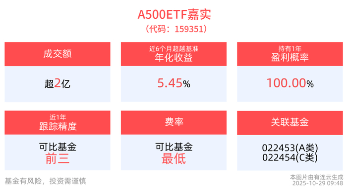 截至10月28日,A500ETF嘉实近1年净值上涨22.78%。从收益能力看,截至2025年10月28日,A500ETF嘉实自成立以来,最高单月回报为11.71%,最长连涨月数为5个月,最长连涨涨幅为28.61%,上涨月份平均收益率为4.15%。截至2025年10月28日,A500ETF嘉实近6个月超越基准年化收益为5.45%。