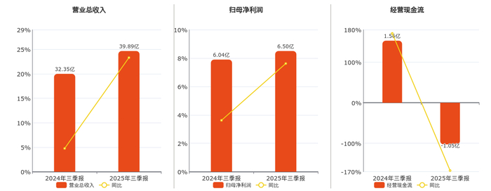 公司营业总收入为39.89亿元,在已披露的同业公司中排名第5,较去年同报告期营业总收入增加7.54亿元,实现2年连续上涨,同比较去年同期上涨23.30%。归母净利润为6.50亿元,在已披露的同业公司中排名第5,较去年同报告期归母净利润增加4599.67万元,实现2年连续上涨,同比较去年同期上涨7.62%。经营活动现金净流入为-1.05亿元。