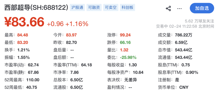 截至发稿时,西部超导报83.66元,涨1.16%,总市值约543.44亿元。