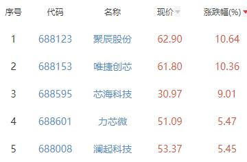 其中,聚辰股份、唯捷创芯、芯海科技、力芯微、澜起科技位列板块涨幅前五位,涨幅分别为10.64%、10.36%、9.01%、5.47%、5.45%。
