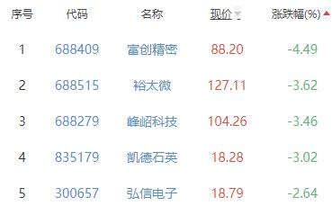 富创精密、裕太微、峰岹科技、凯德石英、弘信电子位列涨幅榜后五位,涨幅分别为-4.49%、-3.62%、-3.46%、-3.02%、-2.64%。