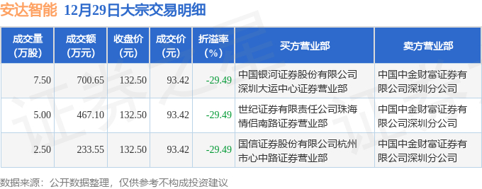 12月29日安达智能现3笔折价29.49%的大宗交易 合计成交1401.3万元
