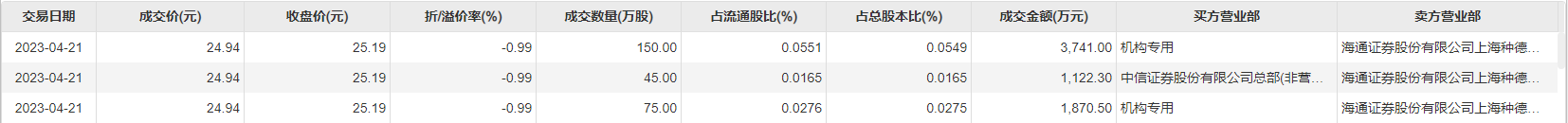 4月21日大宗交易成交270万股,成交额6733.8万元,占当日总成交额的2.77%,成交价24.94元,较市场收盘价25.19元折价0.99%。