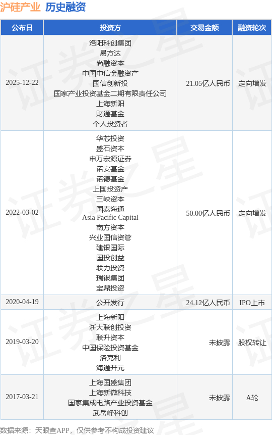 证券之星消息,根据天眼查APP于12月22日公布的信息整理,上海硅产业集团股份有限公司定向增发融资,融资额21.05亿人民币,参与投资的机构包括洛阳科创集团,易方达,尚融资本,中国中信金融资产,国信创新投,国家产业投资基金二期有限责任公司,上海新阳,财通基金,个人投资者。