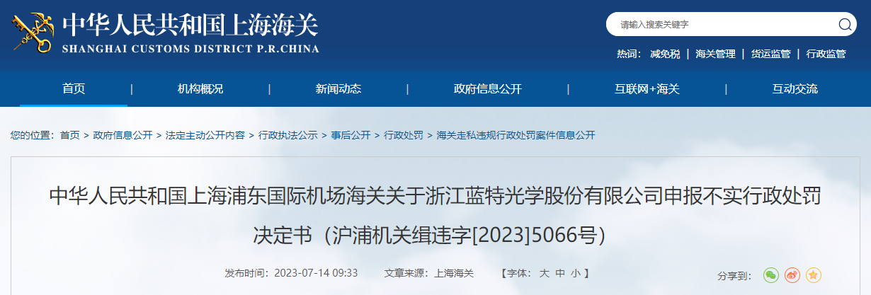 上海浦东国际机场海关关于浙江蓝特光学股份有限公司申报不实行政处罚决定书(沪浦机关缉违字[2023]5066号)