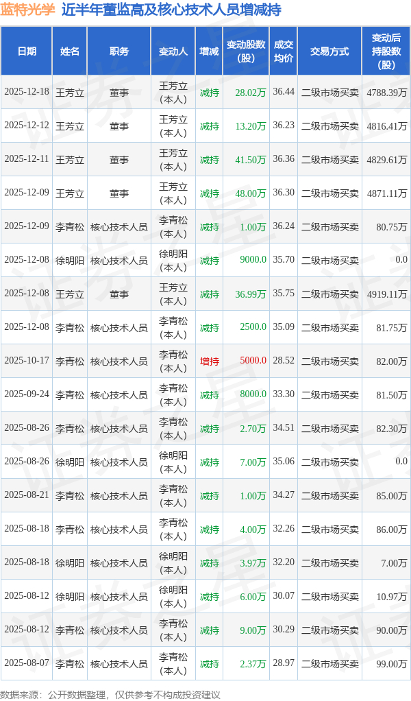 蓝特光学近半年内的董监高及核心技术人员增减持详情如下: