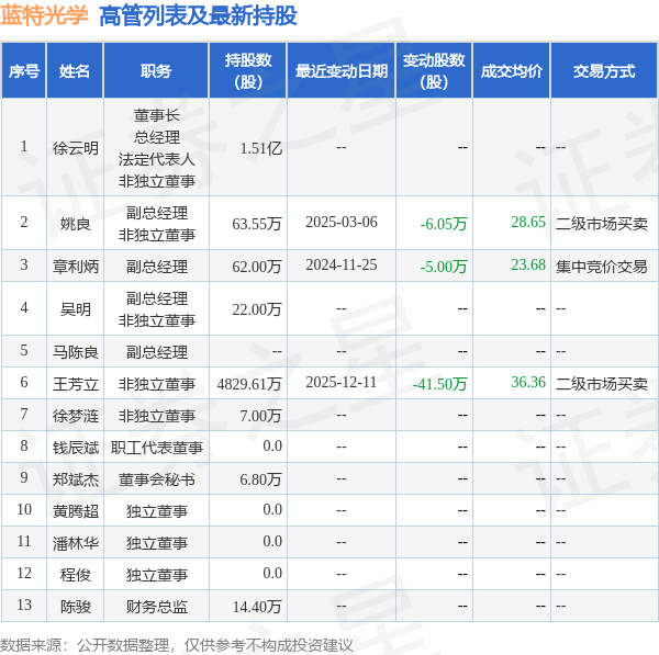 蓝特光学近半年内的董监高及核心技术人员增减持详情如下: