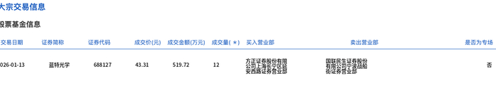 1月13日,蓝特光学大宗交易成交12万股,成交额519.72万元,占当日总成交额的1.34%,成交价43.31元,较市场收盘价42.54元溢价1.81%。