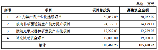 蓝特光学募集资金总额为6.30亿元,扣除发行费用后,募集资金净额为5.55亿元。蓝特光学最终募集资金净额较原计划少1.52亿元。蓝特光学2020年9月16日发布的招股说明书显示,公司计划募集资金7.07亿元,分别用于高精度玻璃晶圆产业基地建设项目、微棱镜产业基地建设项目、补充流动资金。