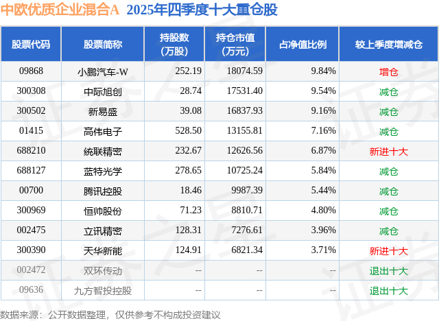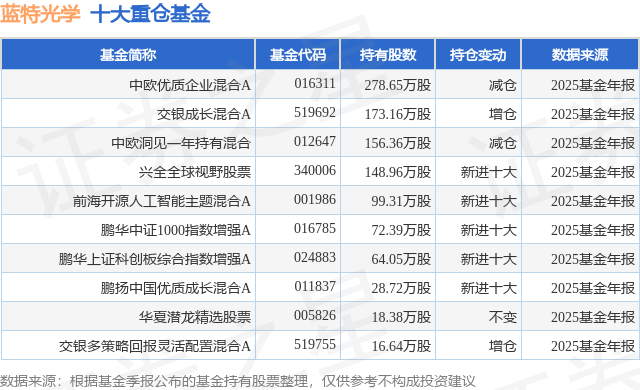 根据2025基金年报公募基金重仓股数据,重仓该股的公募基金共28家,其中持有数量最多的公募基金为中欧基金的中欧优质企业混合A。中欧优质企业混合A目前规模为17.21亿元,最新净值1.3456(3月4日),较上一交易日下跌1.37%,近一年上涨42.32%。该公募基金现任基金经理为代云锋。代云锋在任的基金产品包括:中欧洞见一年持有混合,管理时间为2022年7月7日至今,期间收益率为28.95%;中欧科技成长混合A,管理时间为2024年2月2日至今,期间收益率为107.07%。