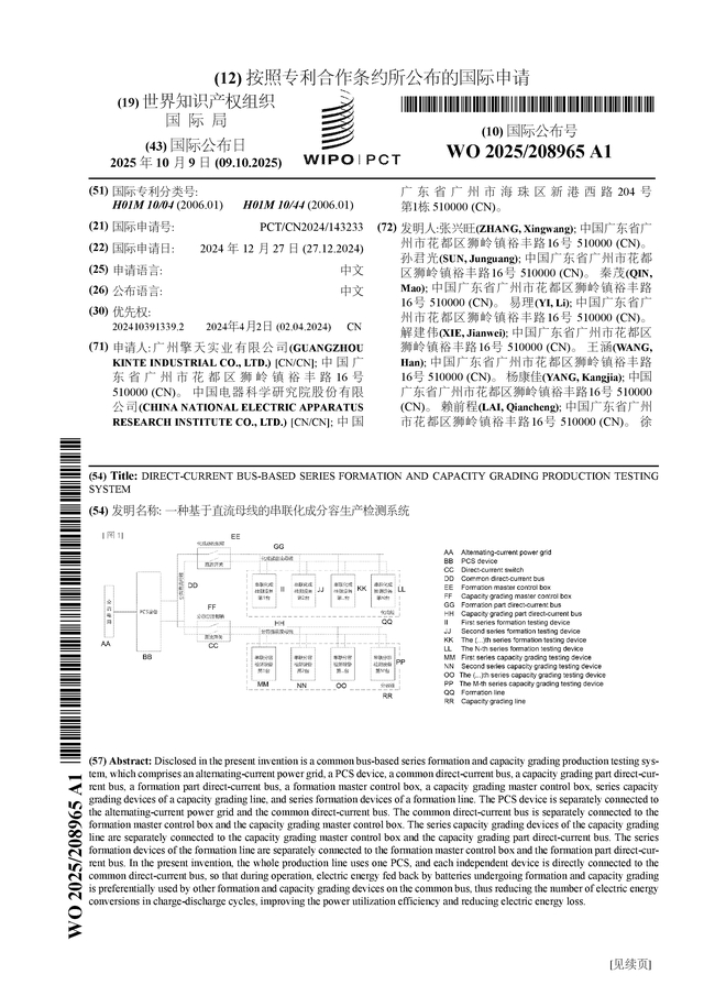 中国电研公布国际专利申请:“一种基于直流母线的串联化成分容生产检测系统”