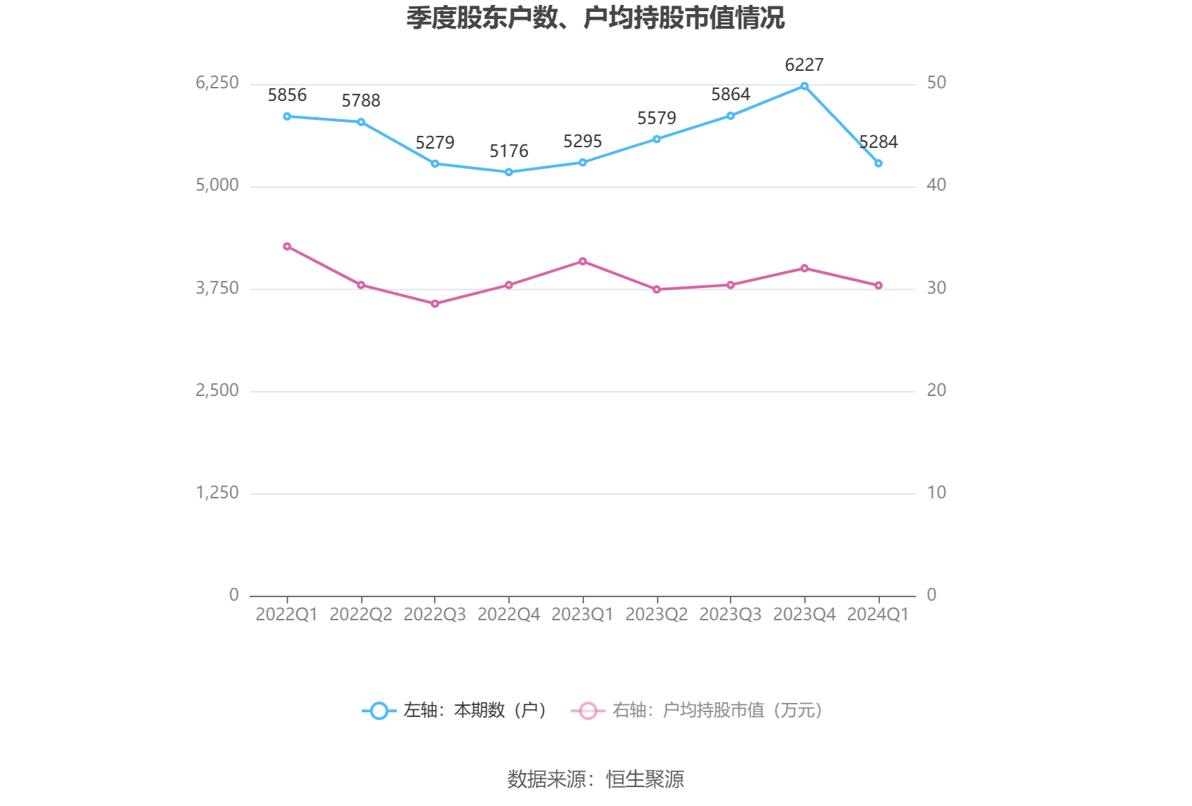 筹码集中度方面,截至2024年一季度末,公司股东总户数为5284户,较上年末下降了943户,降幅15.14%;户均持股市值由上年末的32.02万元下降至30.35万元,降幅为5.22%。