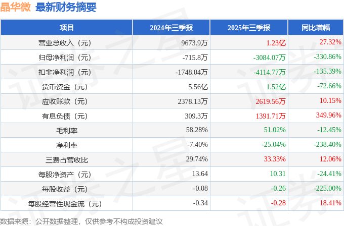 据证券之星公开数据整理,近期晶华微(688130)发布2025年三季报。根据财报显示,晶华微增收不增利。截至本报告期末,公司营业总收入1.23亿元,同比上升27.32%,归母净利润-3084.07万元,同比下降330.86%。按单季度数据看,第三季度营业总收入4454.72万元,同比上升21.8%,第三季度归母净利润-787.9万元,同比下降103.14%。