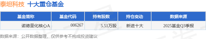 持有泰坦科技最多的基金为诺德量化核心A,目前规模为0.93亿元,最新净值1.4099(10月30日),较上一交易日下跌0.72%,近一年上涨42.17%。该基金现任基金经理为王恒楠。
