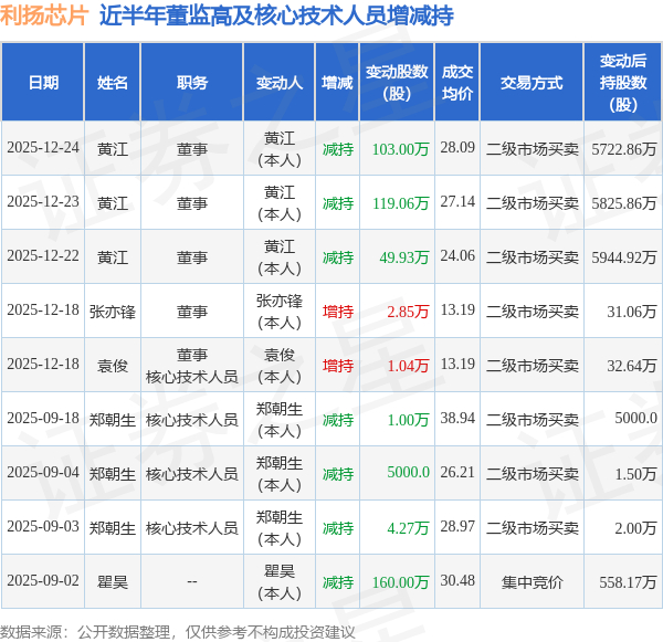 利扬芯片:12月24日高管黄江减持股份合计103万股