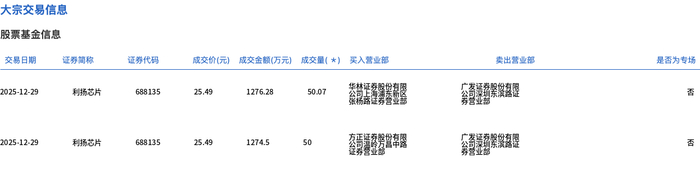 12月29日,利扬芯片大宗交易成交100.07万股,成交额2550.78万元,占当日总成交额的6.37%,成交价25.49元,较市场收盘价28.88元折价11.74%。