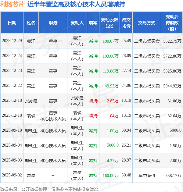 利扬芯片:12月29日高管黄江减持股份合计100.07万股