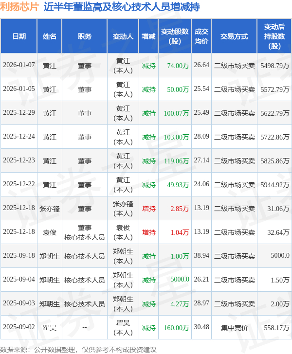 利扬芯片近半年内的董监高及核心技术人员增减持详情如下: