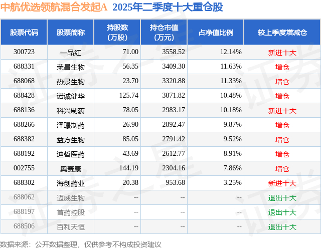 根据2025基金半年报公募基金重仓股数据,重仓该股的公募基金共5家,其中持有数量最多的公募基金为中航基金的中航优选领航混合发起A。中航优选领航混合发起A目前规模为0.58亿元,最新净值1.8436(10月16日),较上一交易日上涨1.91%。该公募基金现任基金经理为王森。王森在任的基金产品包括:中航恒宇港股通价值优选混合发起A,管理时间为2023年9月27日至今,期间收益率为17.76%;中航趋势领航混合发起A,管理时间为2024年6月18日至今,期间收益率为155.01%;中航远见领航混合发起A,管理时间为2024年8月30日至今,期间收益率为55.17%;