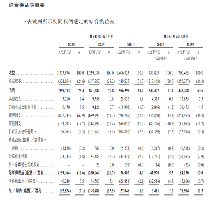 财务数据显示,2022年至2024年及今年上半年,公司营收分别为13.16亿元(人民币,下同)、12.59亿元、14.07亿元、7亿元;净利润分别为-9282.4万元、-1.95亿元、2704.8万元、7896.4万元。
