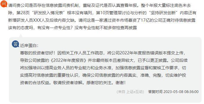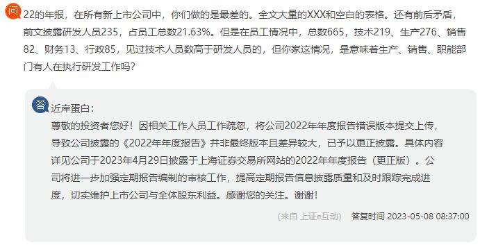 直到4月28日收市后,近岸蛋白才发布了《关于2022年年度报告的更正公告》。在公告中,近岸蛋白称,“因相关工作人员工作疏忽,将公司2022年年度报告错误版本提交上传,导致公司披露的《2022年年度报告》并非最终版本且差异较大”。