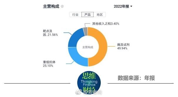 年报显示,近岸蛋白2022年的营收构成中,酶及试剂的占比为49.94%;重组抗体的占比为25.10%;靶点及因子类蛋白的占比为21.56%;CRO及其他的营收占比不足4%。
