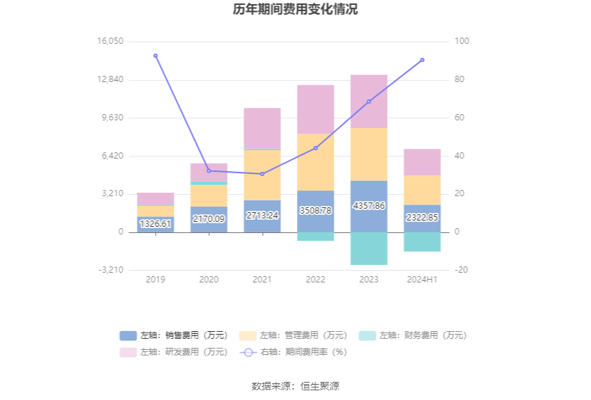 2024年上半年,公司期间费用为5397.10万元,较上年同期减少91.31万元;但期间费用率为90.47%,较上年同期上升16.99个百分点。其中,销售费用同比增长9.66%,管理费用同比增长14.2%,研发费用同比下降11.42%,财务费用由去年同期的-1306.22万元变为-1617.93万元。