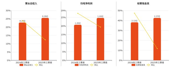 公司营业总收入为9.28亿元,在已披露的同业公司中排名第89。归母净利润为1.44亿元。经营活动现金净流入为2.37亿元。