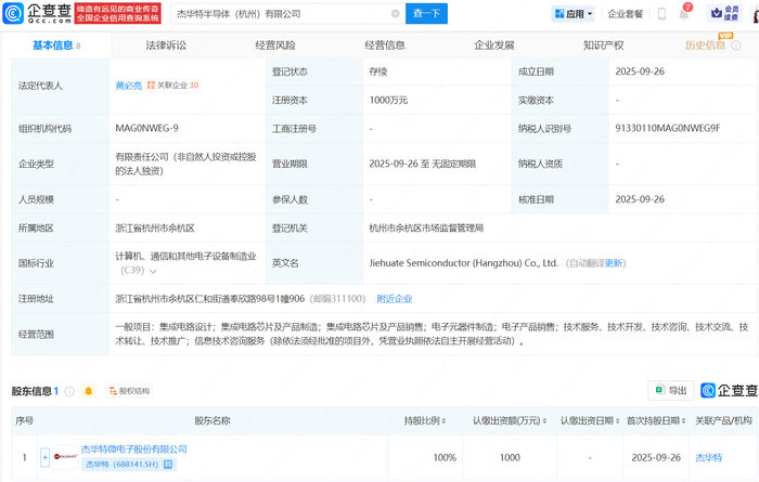 企查查APP显示,近日,杰华特半导体(杭州)有限公司成立,法定代表人为黄必亮,注册资本1000万元,经营范围包含集成电路设计、集成电路芯片及产品制造、集成电路芯片及产品销售等,企查查股权穿透显示,该公司由杰华特(688141)全资持股。
