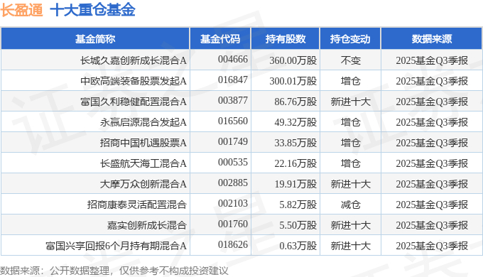 持有长盈通最多的基金为长城久嘉创新成长混合A,目前规模为19.74亿元,最新净值2.2118(10月29日),较上一交易日下跌0.0%,近一年上涨34.08%。该基金现任基金经理为尤国梁。
