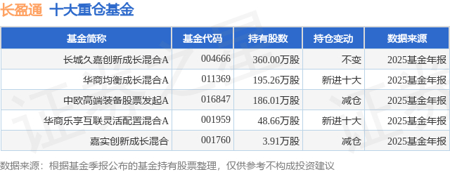 根据2025基金年报公募基金重仓股数据,重仓该股的公募基金共5家,其中持有数量最多的公募基金为长城基金的长城久嘉创新成长混合A。长城久嘉创新成长混合A目前规模为19.94亿元,最新净值3.2469(2月25日),较上一交易日上涨1.86%,近一年上涨61.33%。该公募基金现任基金经理为尤国梁。尤国梁在任的基金产品包括:长城景气成长混合A,管理时间为2023年9月12日至今,期间收益率为67.65%。
