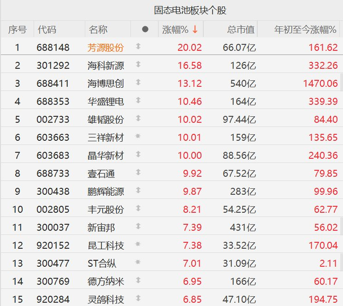 格隆汇11月11日|A股市场电池股走强,其中,芳源股份20CM涨停,海科新源涨超16%,海博思创涨超13%,华盛锂电涨超10%,雄韬股份、三祥新材、晶华新材10CM涨停,壹石通、鹏辉能源涨超9%,丰元股份涨超8%,新宙邦、昆工科技涨超7%,德方纳米、灵鸽科技涨超6%。