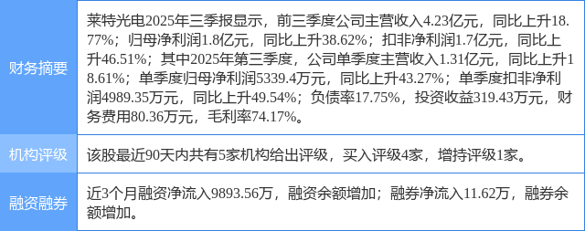 2025年10月28日,开源证券研究员周佳,赵晨旭发布了对莱特光电的研报《中小盘信息更新:2025Q3业绩延续向好态势,公司降本增效成果显著》,该研报对莱特光电给出“买入”评级。研报中预计2025-2027年归母净利润分别为3.07/4.12/6.09亿元,对应EPS分别为0.76/1.02/1.51元,当前股价对应2025-2027年的PE分别为33.7/25.1/17.0倍,看好公司持续受益于下游OLED市场需求攀升以及未来新产品放量,维持“买入”评级。证券之星数据中心根据近三年发布的研报数据计算,该研报作者对此股的盈利预测准确度为63.18%。
