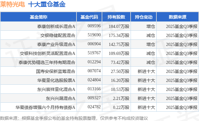 根据2025基金Q3季报公募基金重仓股数据,重仓该股的公募基金共10家,其中持有数量最多的公募基金为泰康基金的泰康创新成长混合A。泰康创新成长混合A目前规模为8.12亿元,最新净值1.2658(12月18日),较上一交易日下跌1.05%,近一年上涨41.23%。该公募基金现任基金经理为薛小波。薛小波在任的基金产品包括:泰康产业升级混合A,管理时间为2019年5月17日至今,期间收益率为164.44%;泰康优势精选三年持有期混合,管理时间为2021年8月31日至今,期间收益率为13.87%。