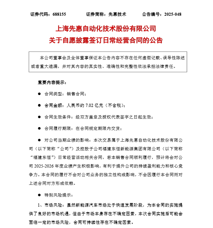8月7日晚,先惠技术(688155.SH)公告称,公司及控股子公司福建东恒新能源集团有限公司,与宁德时代(300750.SZ)及其控股子公司签订7.02亿元各类合同及定点通知单。若本销售合同顺利履行,预计将会对先惠技术2025-2026年度业绩产生积极影响,有利于提升公司的持续盈利能力和核心竞争力。