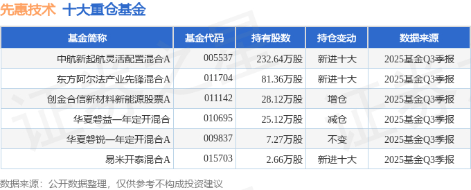 持有先惠技术最多的基金为中航新起航灵活配置混合A,目前规模为1.2亿元,最新净值0.9174(10月29日),较上一交易日上涨5.0%,近一年上涨81.05%。该基金现任基金经理为韩浩。